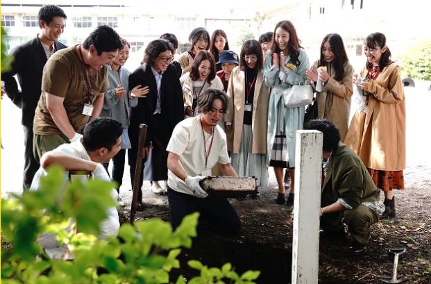 同窓会のハイライトは、22年前に校庭に埋めたタイムカプセルの掘り起こしでした。