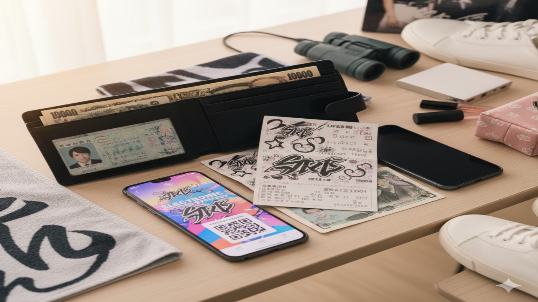 それは、 入場券である「チケット」、 本人確認に必要な「身分証明書」、 物販や交通費に使う「財布」、 そして連絡や電子チケットの表示に不可欠な「スマートフォン」の4点です。